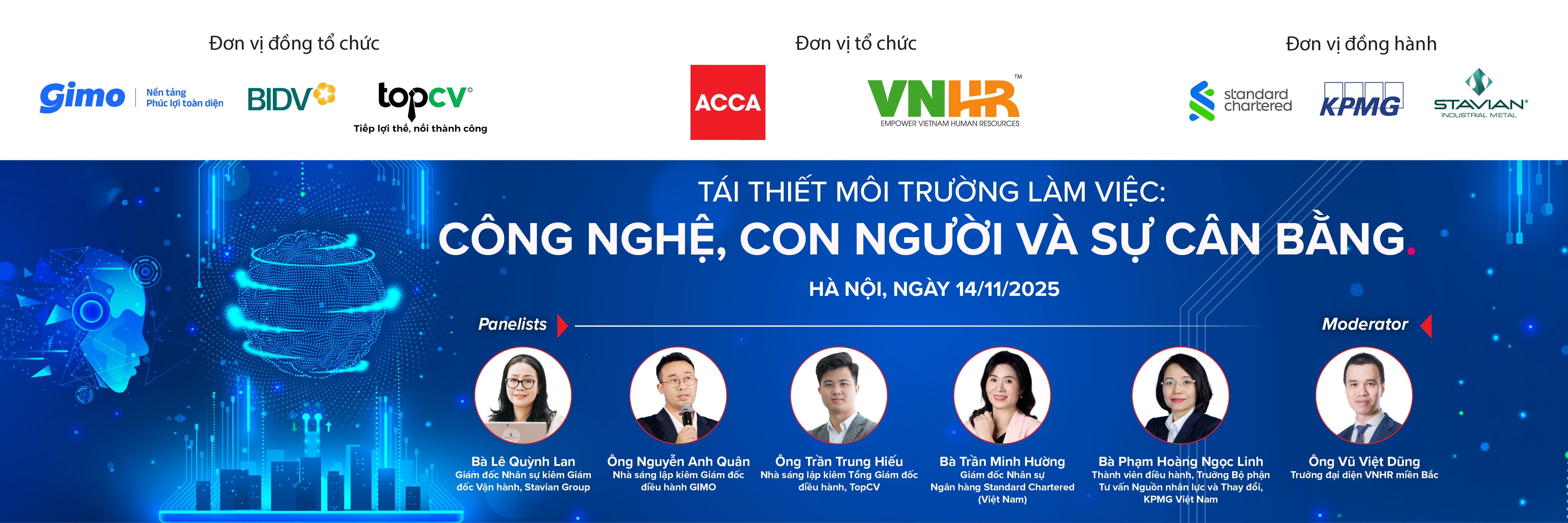 Sự kiện “Tái thiết môi trường làm việc: Công nghệ, Con người & Sự cân bằng”, do VNHR và ACCA phối hợp cùng các đối tác tổ chức, là diễn đàn kết nối các lãnh đạo nhân sự, chuyên gia công nghệ và nhà tuyển dụng hàng đầu, mang đến cho quý anh/chị những giá trị thiết thực: